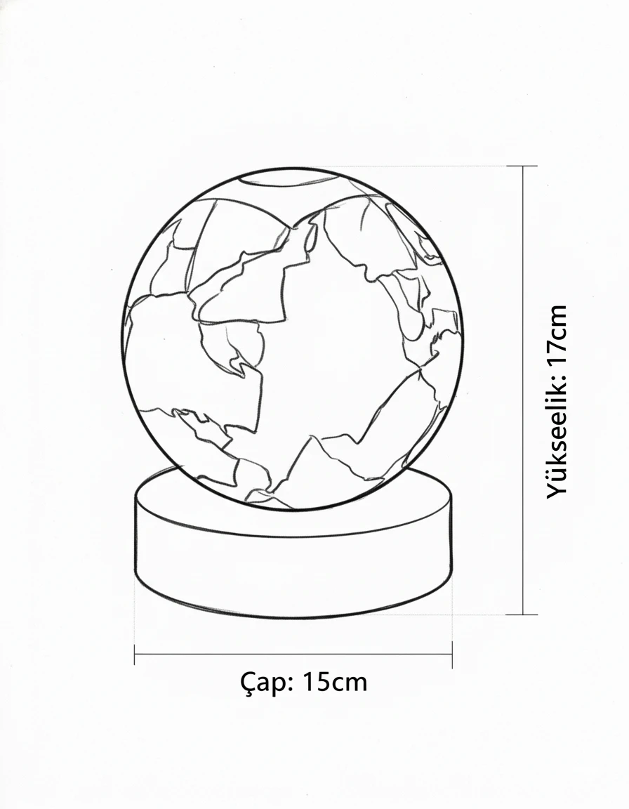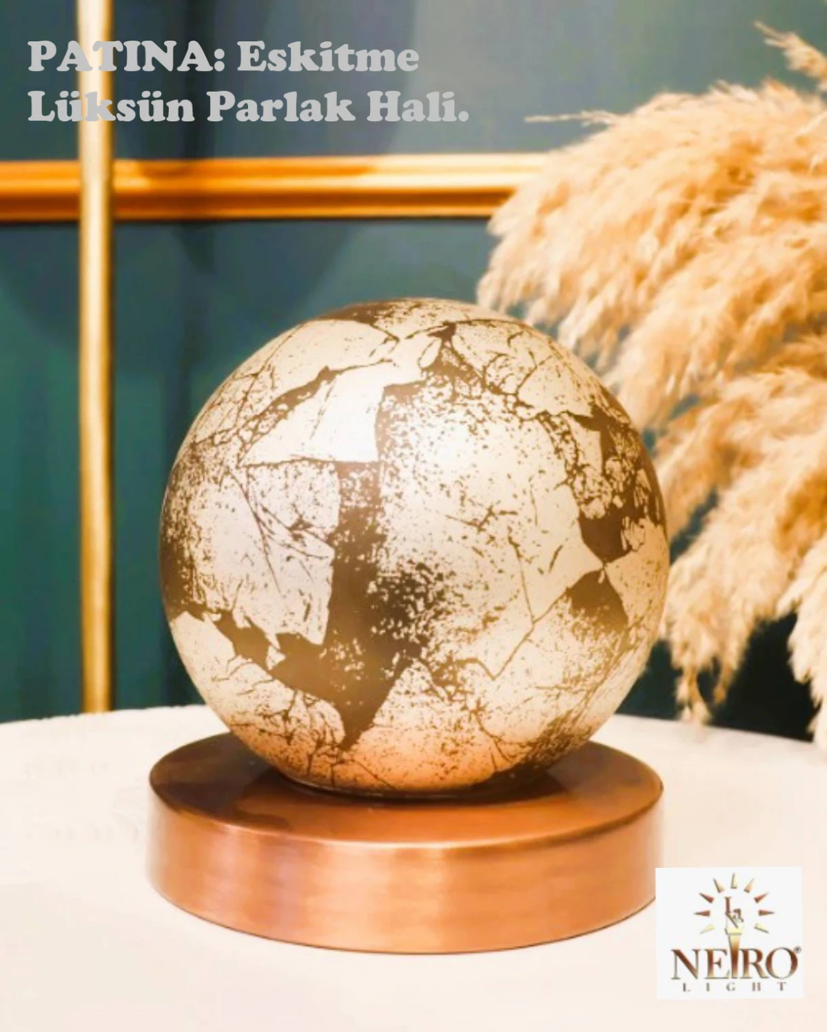 Patina Dokusu: Küre üzerindeki eskitme, harita benzeri desen, her bir ürünü benzersiz kılar ve ışığı dramatik bir şekilde yayar.