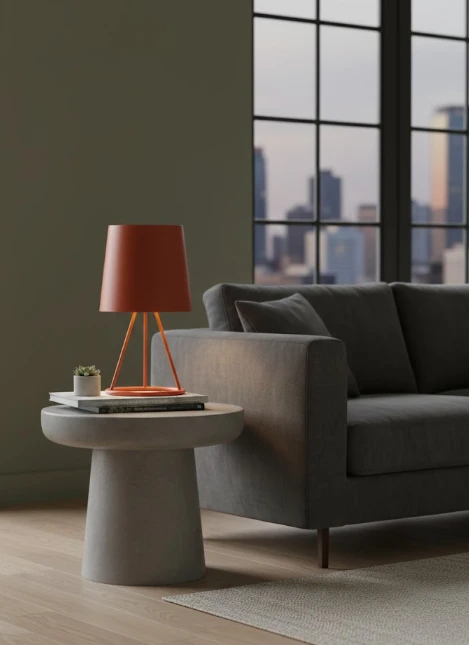 Üç ayaklı (tripod) taban yapısı sayesinde sağlamlık ve estetiği bir arada sunarken, mat turuncu bitişiyle gün ışığında bile odanın odak noktası olmayı sürdürür. Yumuşak ışık dağılımıyla çalışma masanızda verimliliği, oturma odanızda ise huzurlu bir ambiyansı destekler. Brüt beton yüzeyler, ahşap dokular ve modern mobilyalarla kusursuz bir uyum yakalayan bu parça, dekorasyonunuzda eksik olan o "iddialı" detay.