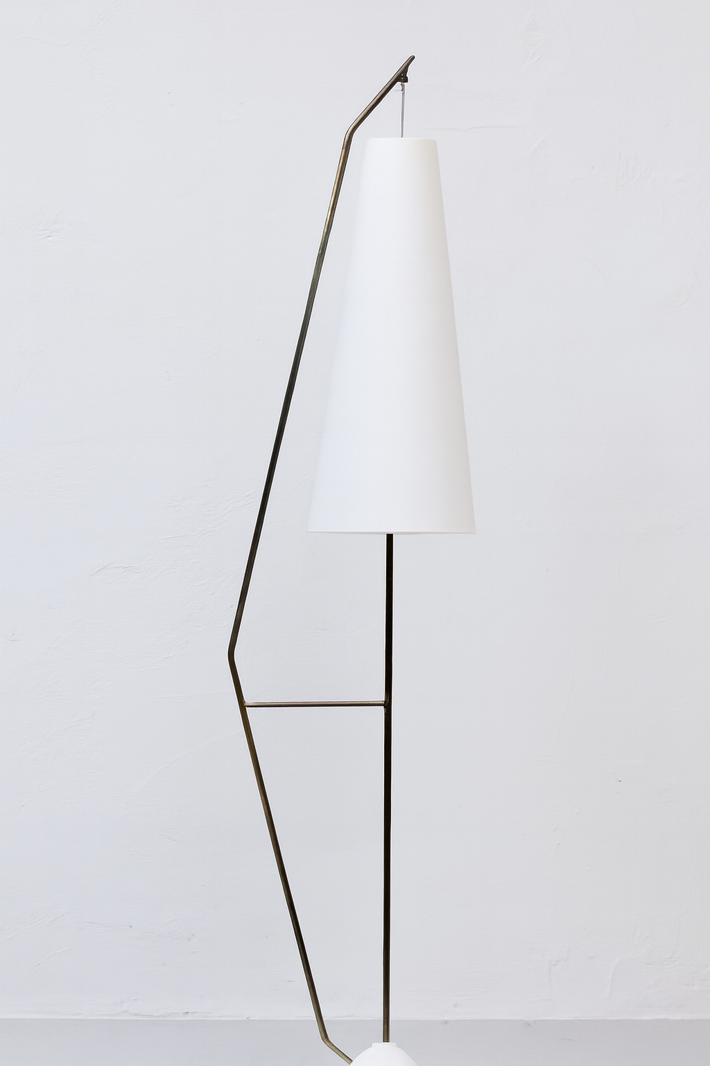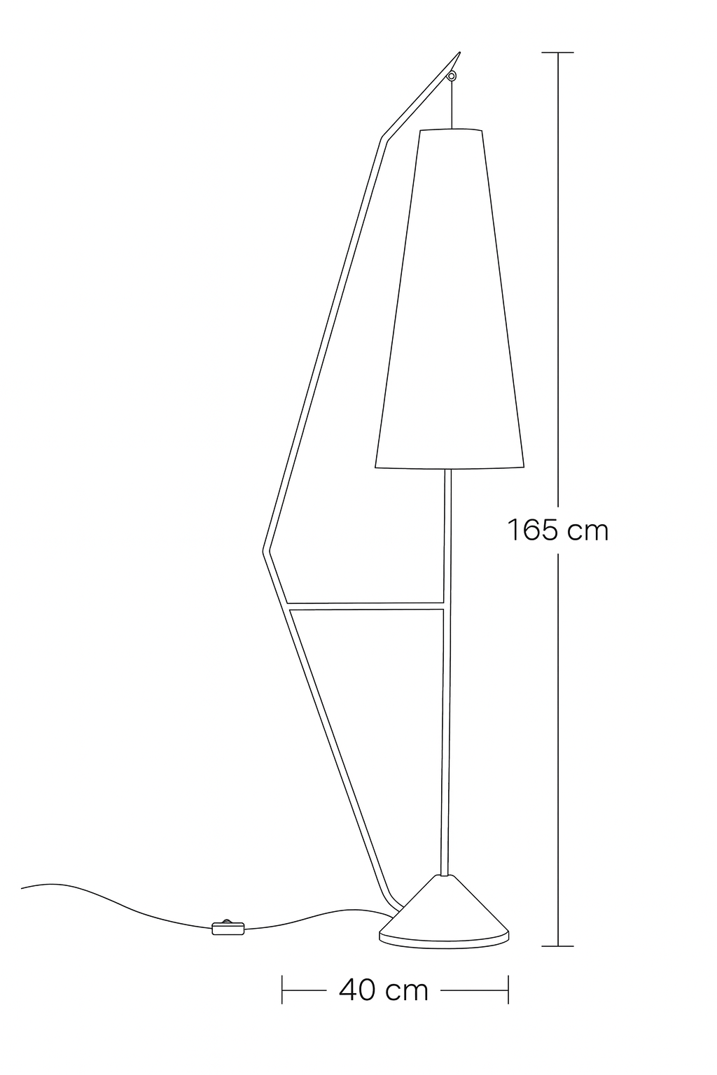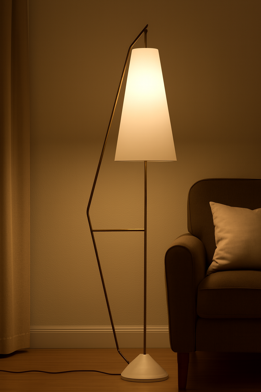 Açılı metal gövdesiyle mekâna çizgi katar, beyaz konik başlığıyla ışığı yumuşakça süzer.