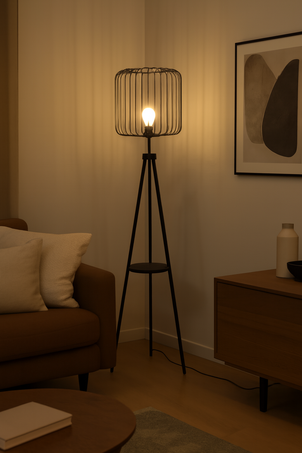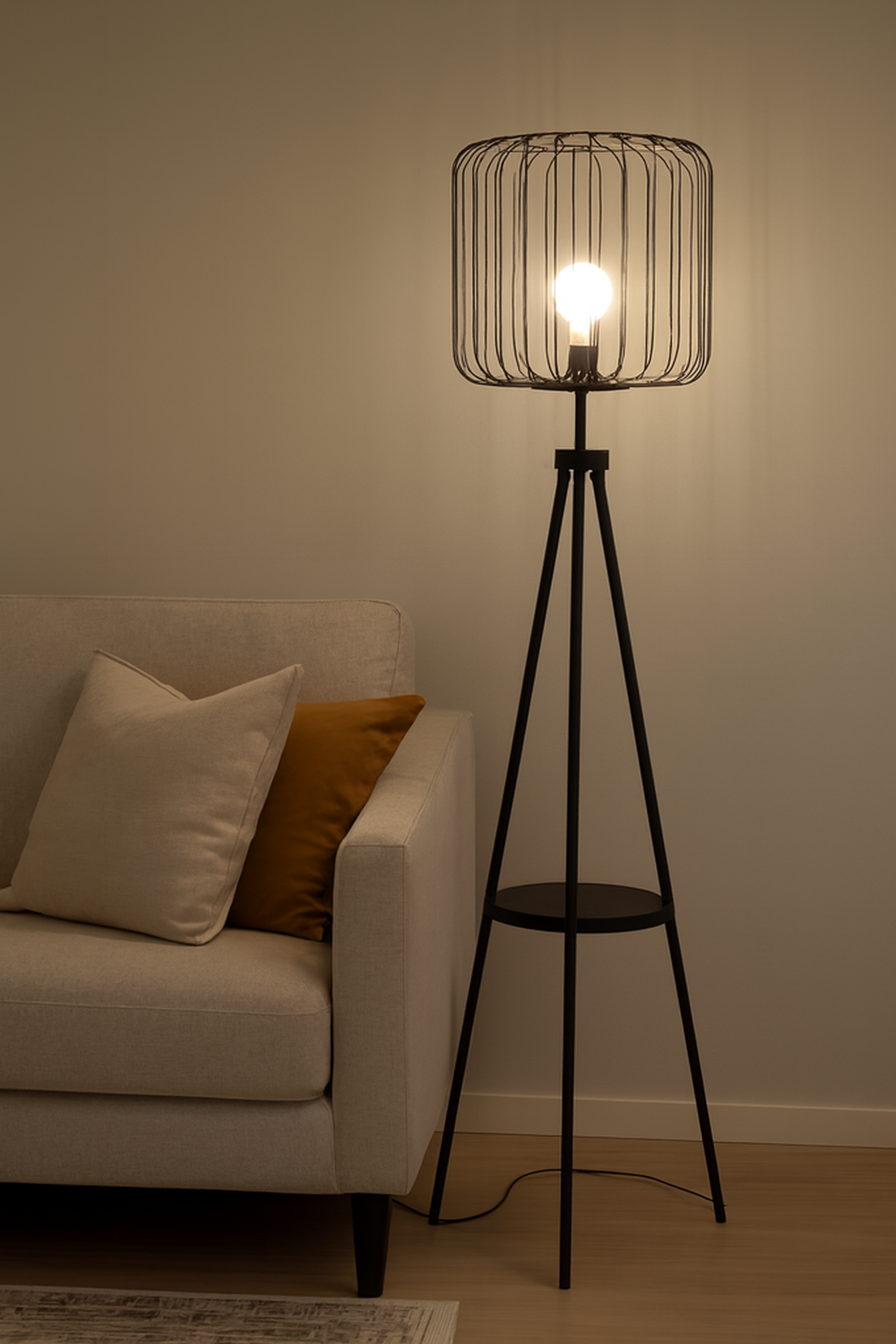 Üç ayaklı tripod yapısı, ortadaki raf detayı ve tel kafes başlığıyla hem dengeli hem karakterli bir duruş sergiliyor.