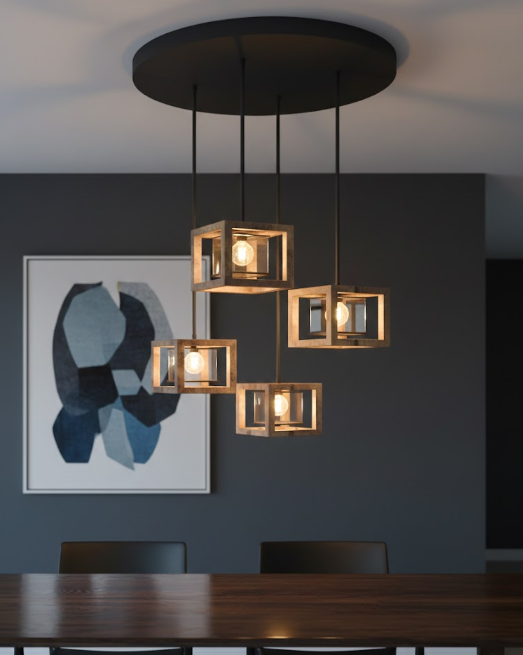 Açıklama: Evinizde veya ofisinizde modern bir dokunuş arayanlar için Nero Aydınlatma kalitesi şimdi çok daha erişilebilir! Şık ahşap görünümlü kübik çerçeveleri, cam fanus korumalı ışık kaynakları ve minimalist siyah tepsisiyle bu özel tasarım avize, mekanınıza derinlik katacak.