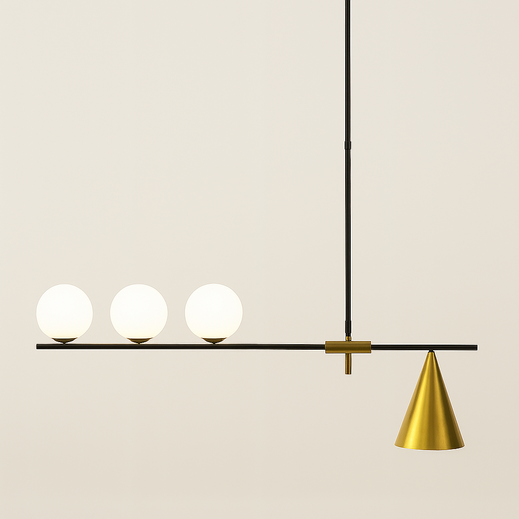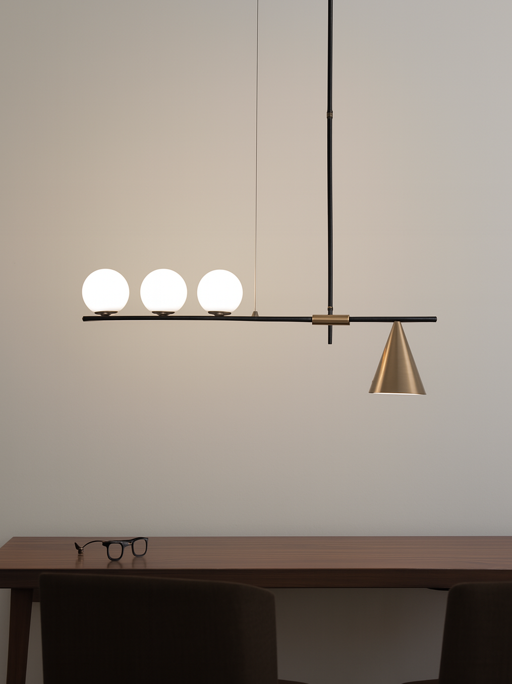 Seren, geometrik sadeliğiyle mekâna huzur getirirken, pirinç detayları ve mat yüzeyleriyle sıcak bir dokunuş sunar. Sol tarafta yer alan konik başlık, odaklanmış bir ışıkla derinlik yaratırken; sağdaki iki küresel cam, yumuşak ve dengeli bir aydınlatma sağlar.