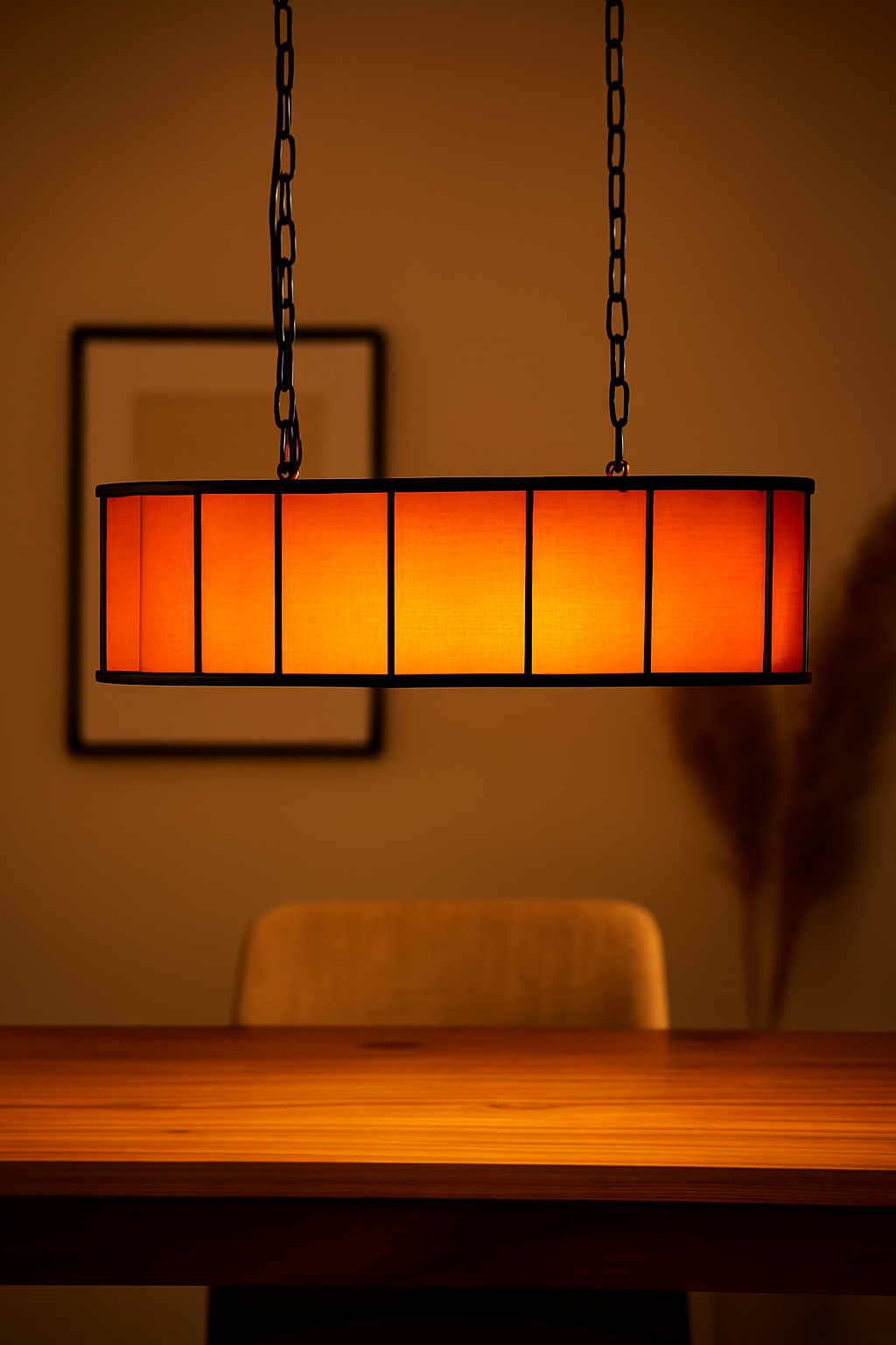 Zincir detaylarıyla tavandan özgürce süzülen bu dikdörtgen form, hem modern hem de duygusal bir atmosfer yaratır.