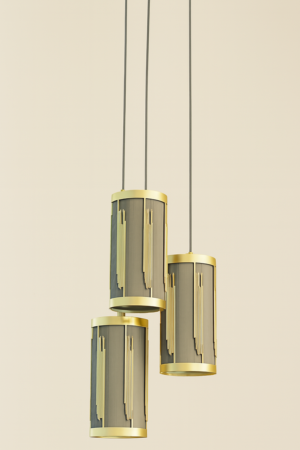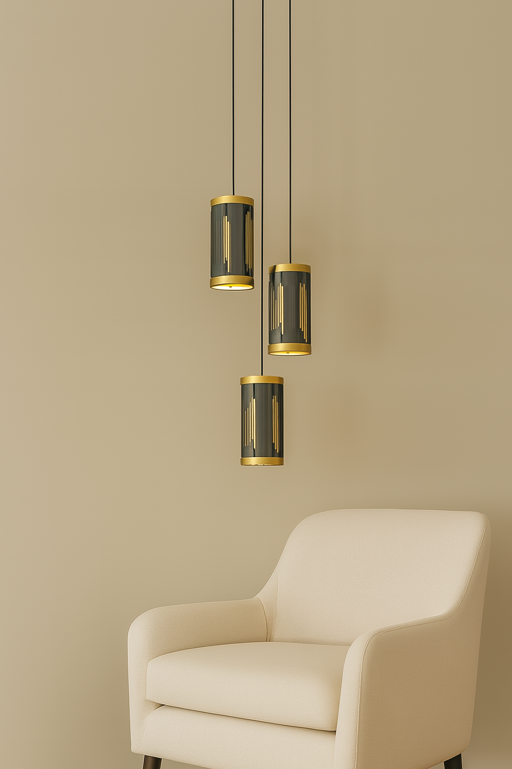 ALTURA, üç silindirik başlığıyla mekâna ritmik bir ışık kompozisyonu sunar. Farklı yüksekliklerde konumlanan gövdeler, sade bir fon üzerinde bile güçlü bir duruş sergiler. Pirinç detaylar ve keskin çizgiler, modern tasarımın en zarif hâlini temsil eder.