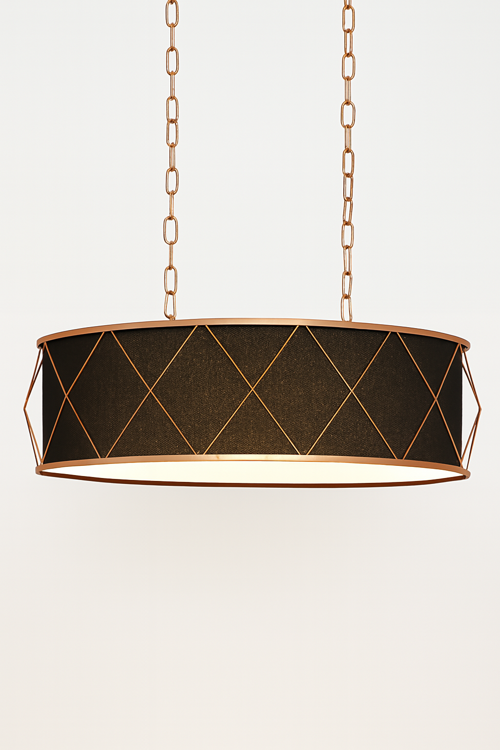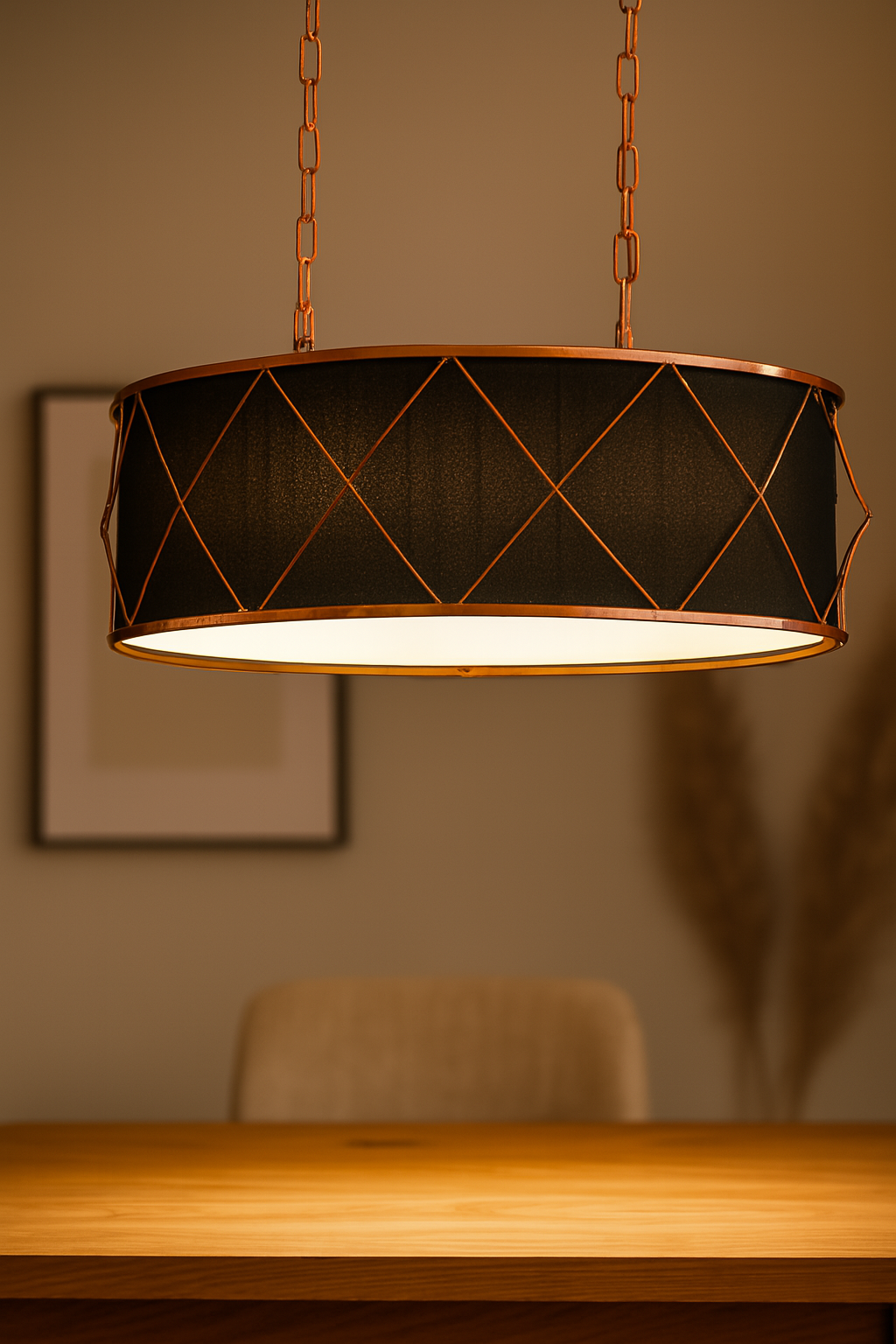 • Malzeme: Siyah tekstil yüzey, fırçalanmış bakır metal, sıcak ışık difüzörü