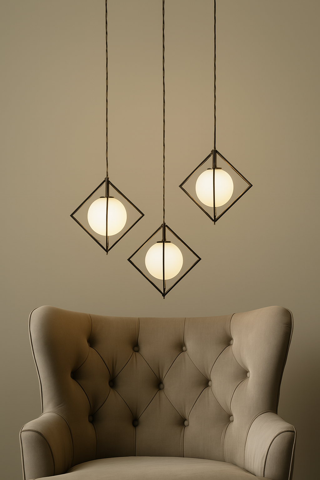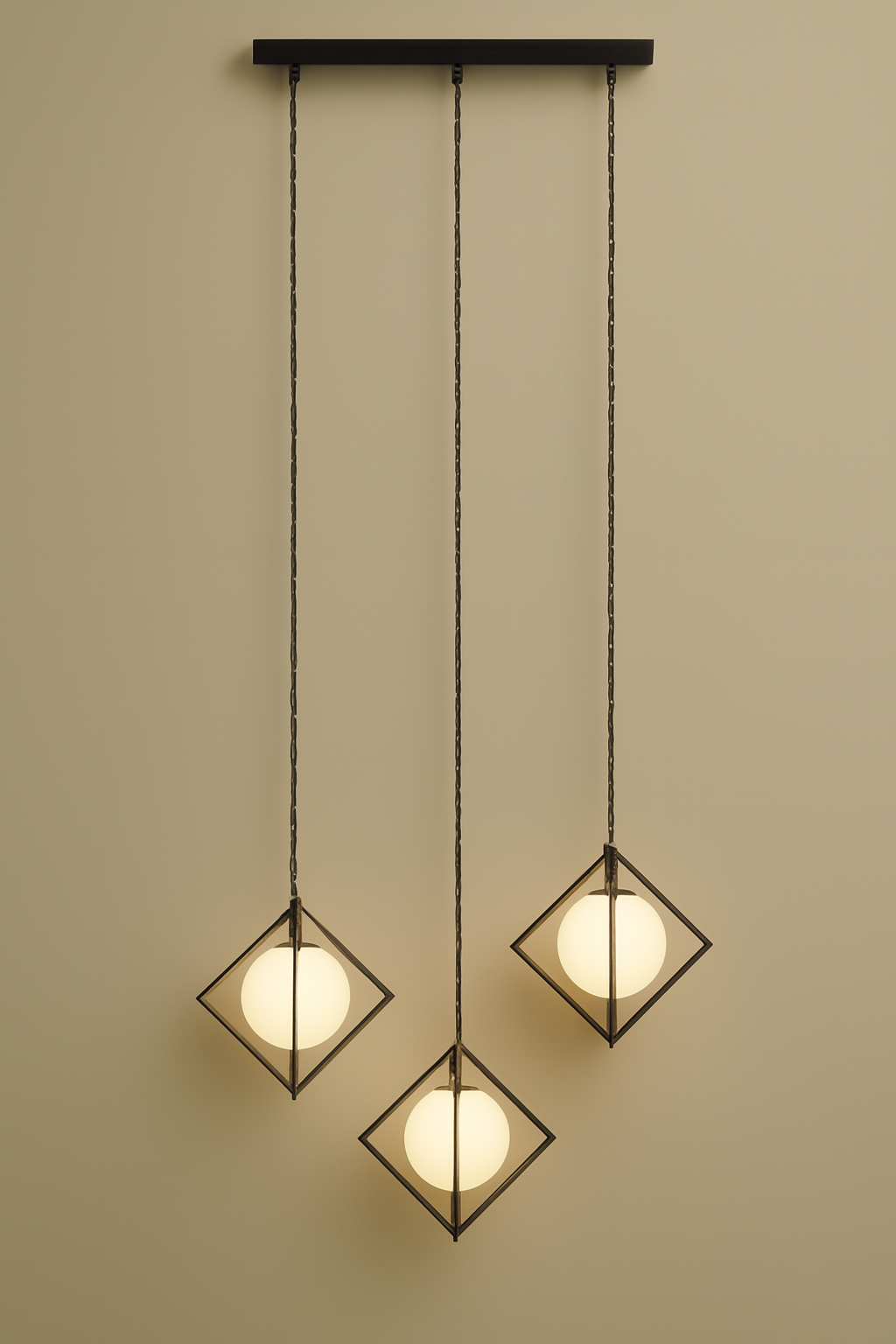 LUMACRA, ışığın mimarisini yeniden tanımlıyor. Küp formundaki metal çerçeveler içinde yer alan opal küreler, hem teknik hem de duygusal bir denge sunuyor. Asimetrik sarkıt yapısı, mekâna ritim ve derinlik katarken; sade fonlarda bile güçlü bir karakter sergiliyor.