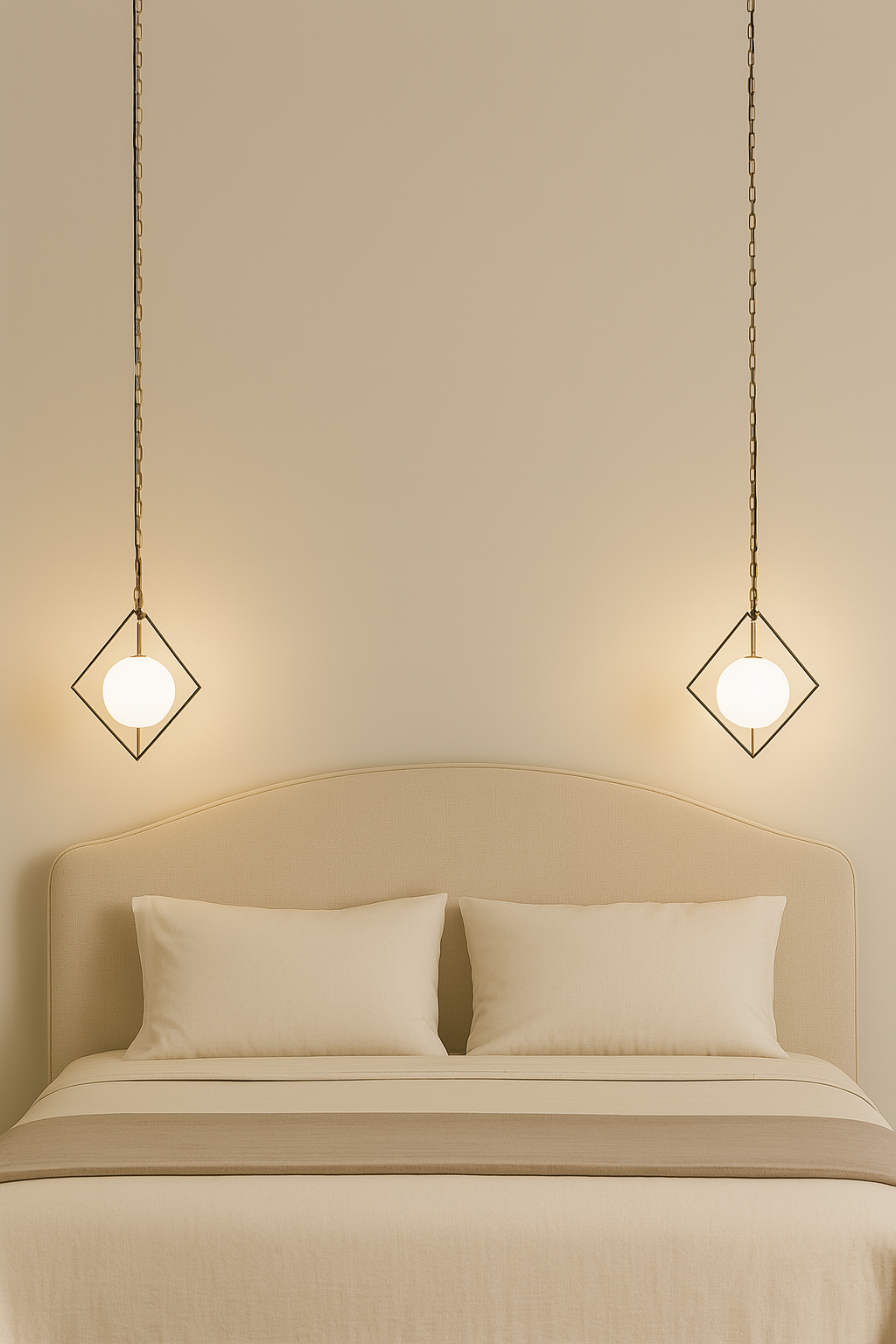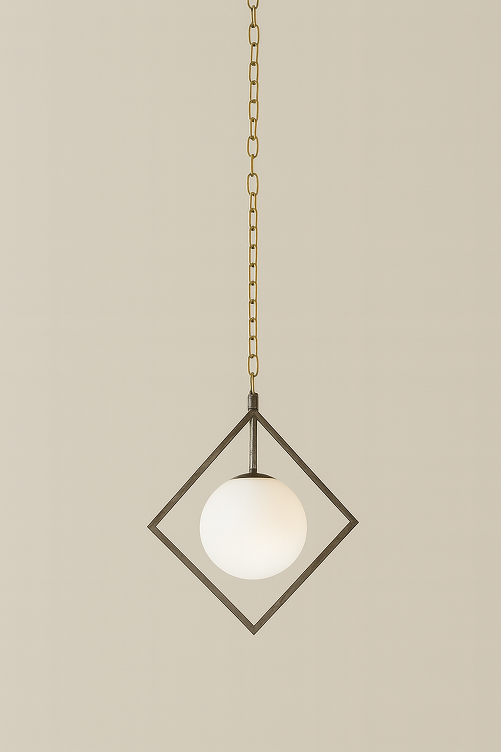 LUMARCA, minimalist çizgileriyle mekâna hem teknik bir duruş hem de duygusal bir sıcaklık getiriyor. Pirinç zincirle zarifçe süzülen geometrik çerçeve, içindeki küresel ışıkla hem odak hem ambiyans yaratıyor.