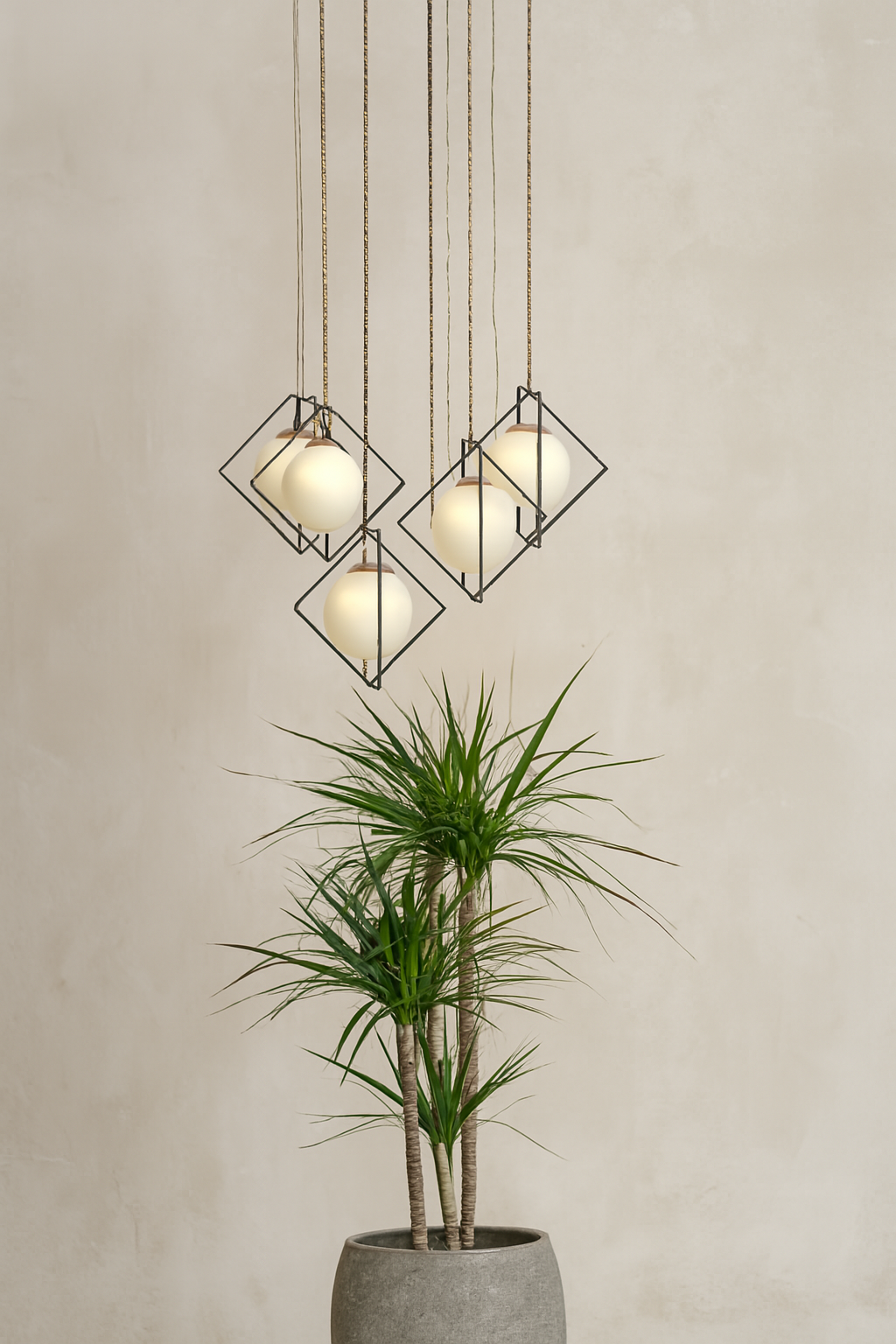 Minimalist çizgilerle şekillenen Lumaçra, iç mekânlara hem modern bir estetik hem de duygusal bir sıcaklık getiriyor. Siyah metal çerçeveler içinde süzülen küresel ışıklar, saksı bitkilerinin üzerinde konumlandığında doğayla bütünleşen bir ışık heykeline dönüşüyor.