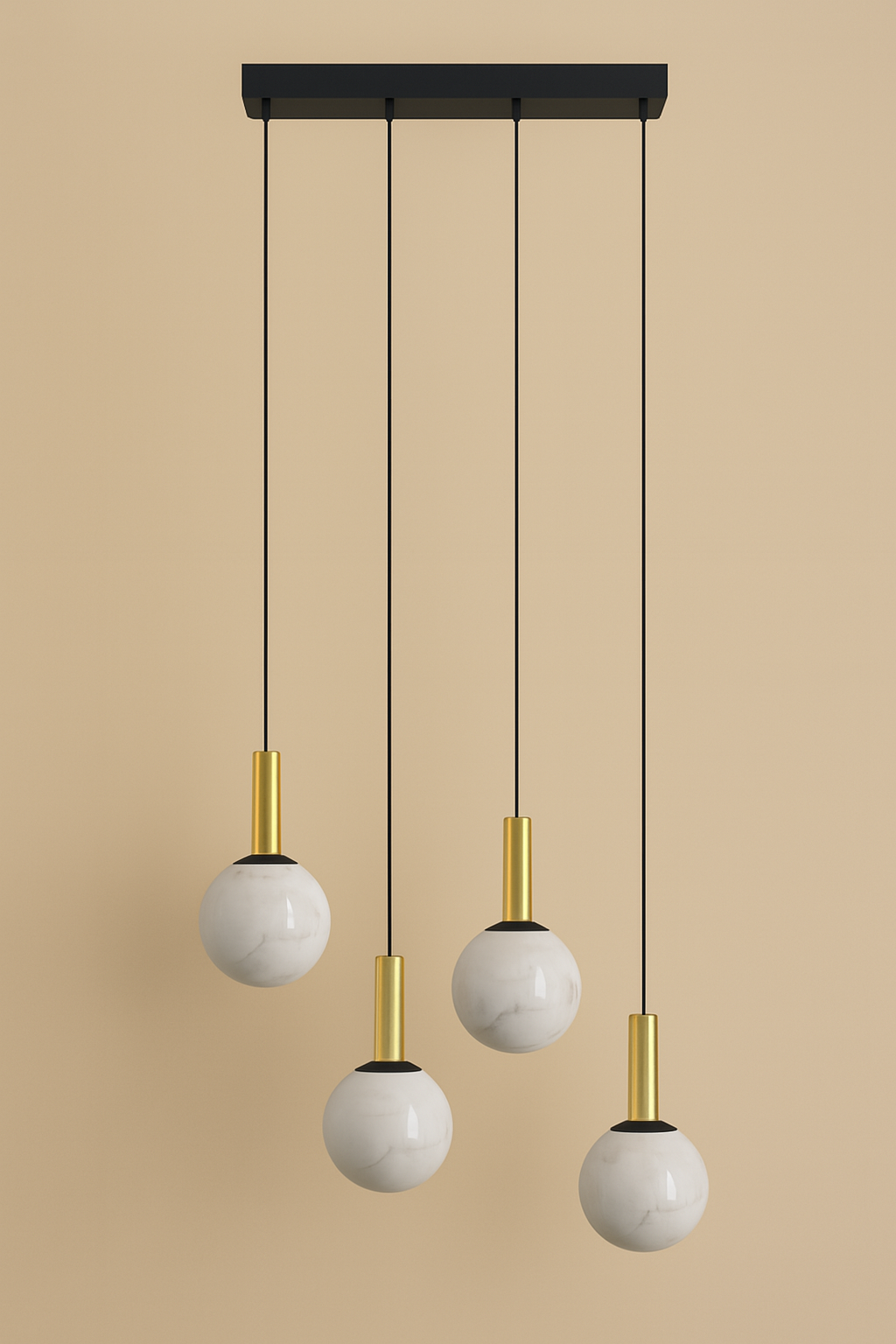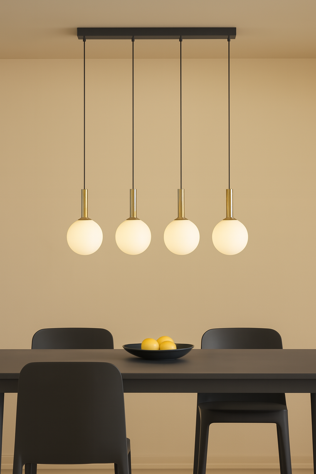 Dört opal küre, farklı yüksekliklerde asılı durarak mekâna ritmik bir ışık yayar. Her biri, sofradaki bir anı aydınlatmak için konumlandırılmış gibi. Siyah silindirik detaylar ve ince kablolar, minimalist bir zarafetle birleşerek hem modern hem de sıcak bir atmosfer yaratır.