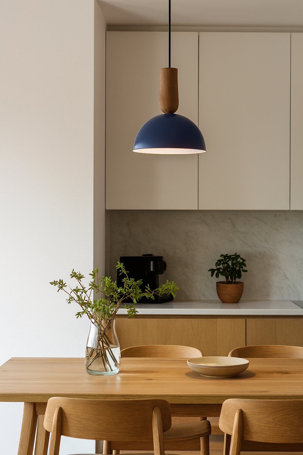 Doğal ahşap ve derin mavi metalin buluştuğu Luma, sade tasarımıyla mekânınıza huzur ve karakter katıyor.