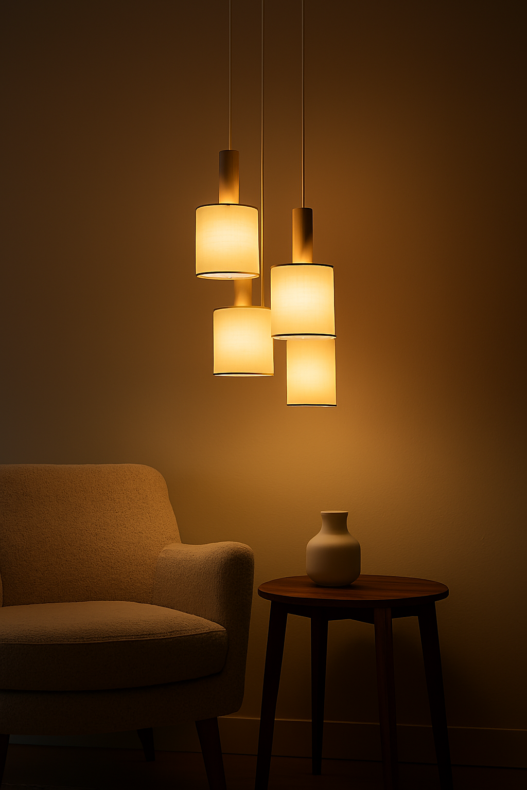 Kumaş şapkalar ışığı yumuşatırken, metal boyunluklar tasarıma modern bir dokunuş katıyor. Her başlık farklı yükseklikte asılı durarak mekâna ritmik bir kompozisyon sunuyor. Bu denge, hem teknik hem duygusal bir bütünlük yaratıyor.