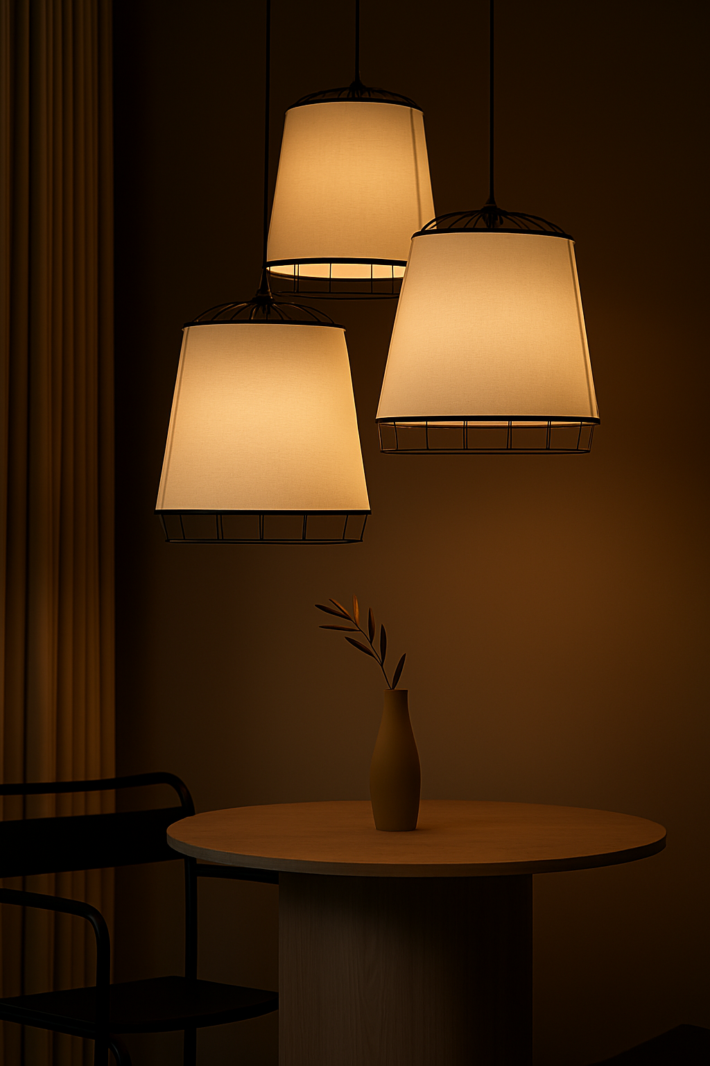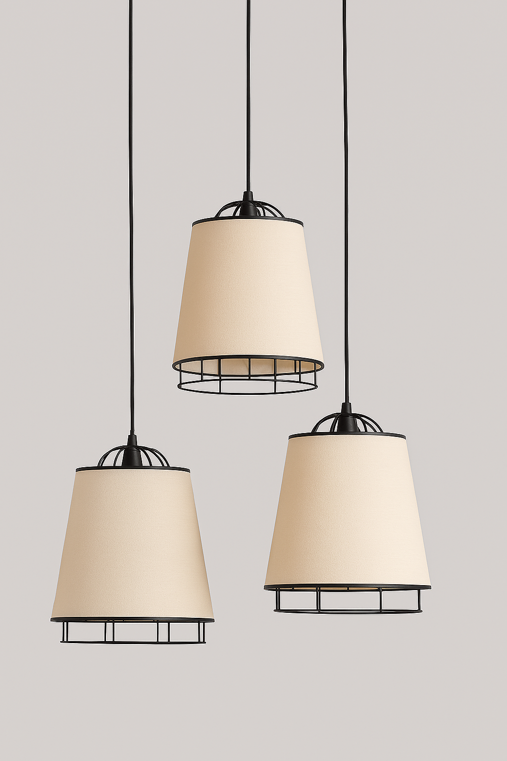 Trioa, üç ayrı sarkıt formuyla mekâna ritim ve derinlik katar. Kumaş dokulu konik başlıkları, siyah metal kafesle tamamlanarak hem modern hem sıcak bir atmosfer yaratır.