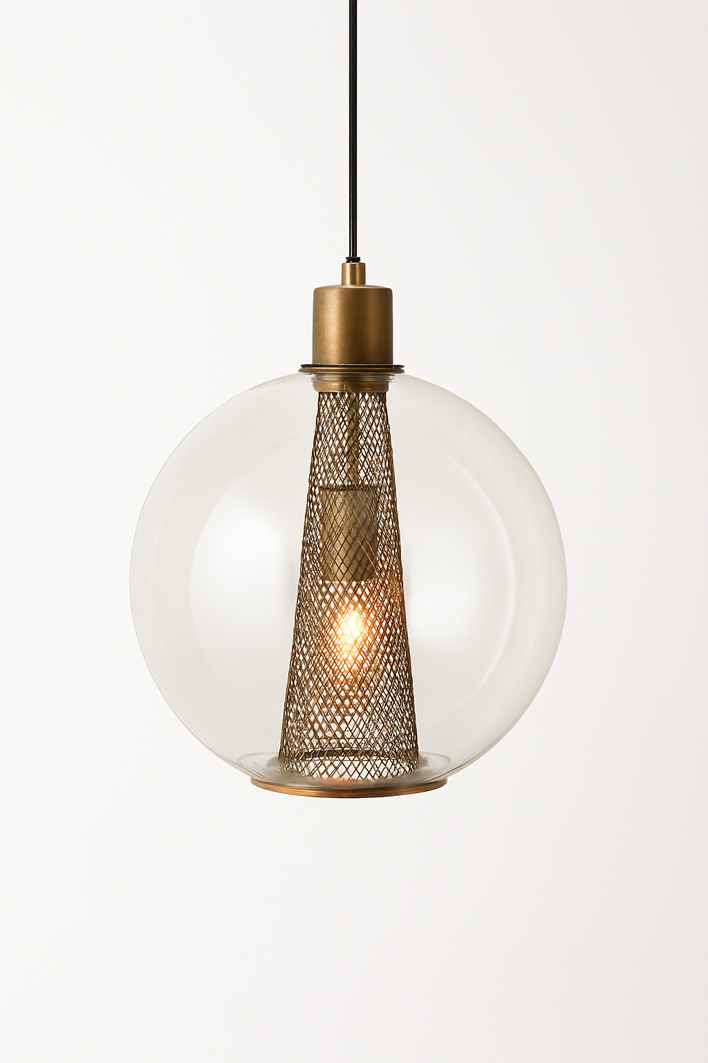 İçindeki tel örgü koni, vintage filament ampulü nazikçe sararken; dışındaki cam küre ışığı özgürce yayar.